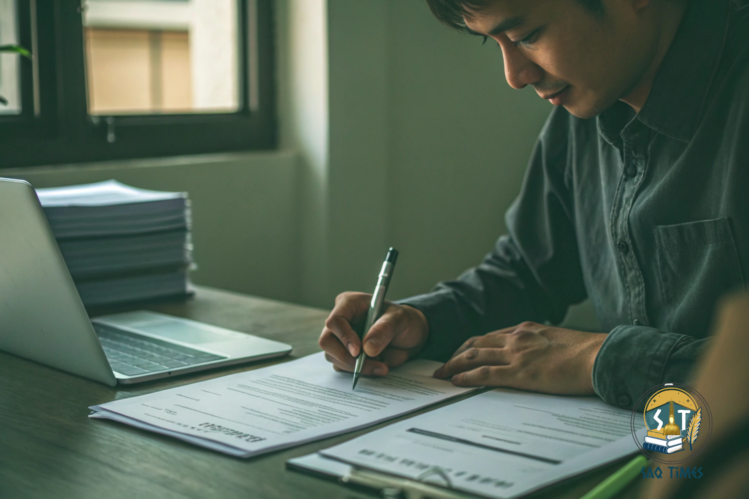Құжат толтырып жатқан талапкер. Нейрожелі арқылы жасалған көрнекі сурет: SaqTimes